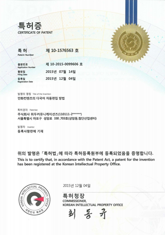 [한국/특허] 만화 컨텐츠의 다국어 자동 편집 방법 페이지 정보 작성자 WeDu 댓글 0건 조회 6,303회 작성일 19-05-30 18:49 본문 2015-07-14 특허 10-2015-0099606 만화 컨텐츠의 다국어 자동 편집 방법 List Previous[한국/특허] 전자서적과 연동되는 게임의 제공 장치 19.05.30