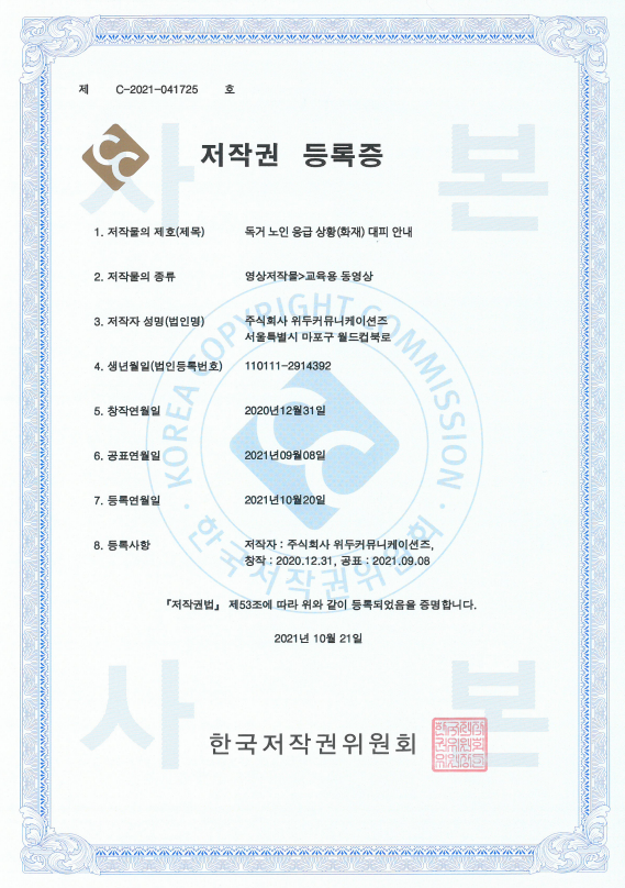 [한국/저작권] 독거 노인 응급 상황(화재) 대피 안내 페이지 정보 작성자 WeDu 댓글 0건 조회 6,363회 작성일 21-12-31 12:41 본문 2021-10-21 저작권 C-2021-041725 영상저작물>교육용 동영상 List Previous[한국/저작권] 장보기 인지훈련 게임 21.12.31 Next[한국/저작권] OLL KIDS/MATH 21.12.31