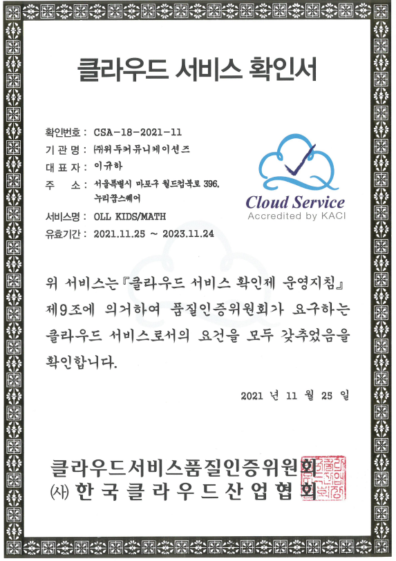 [한국/인증서] OLL KIDS/MATH 클라우드 서비스 확인서 페이지 정보 작성자 WeDu 댓글 0건 조회 9,583회 작성일 21-12-31 12:46 본문 2021-11-25 확인번호 CSA-18-2021-11 서비스명 : OLL KIDS/MATH List Previous[한국/확인서] OLL KIDS/MATH 파스-타 호환성 확인서 21.12.31 Next[한국/저작권] 장보기 인지훈련 게임 21.12.31