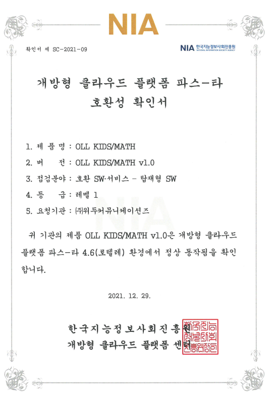 [한국/확인서] OLL KIDS/MATH 파스-타 호환성 확인서 페이지 정보 작성자 WeDu 댓글 0건 조회 10,037회 작성일 21-12-31 12:48 본문 2021-12-29 확인서 제 SC-2021-09 점검분야 : 호환 SW서비스 - 탑재형 SW List Next[한국/인증서] OLL KIDS/MATH 클라우드 서비스 확인서 21.12.31
