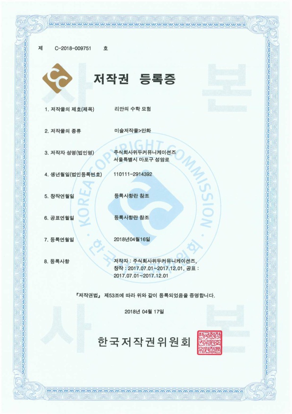 [한국/저작권] 리안의 수학 모험 페이지 정보 작성자 WeDu 댓글 0건 조회 5,973회 작성일 19-05-30 19:07 본문 2018-04-16 저작권 C-2018-009751 리안의 수학 모험 / 미술저작물>만화 List Previous[한국/저작권] 길리 19.05.30 Next[한국/저작권] 신입사원조기전력화 이러닝 콘텐츠 19.05.30
